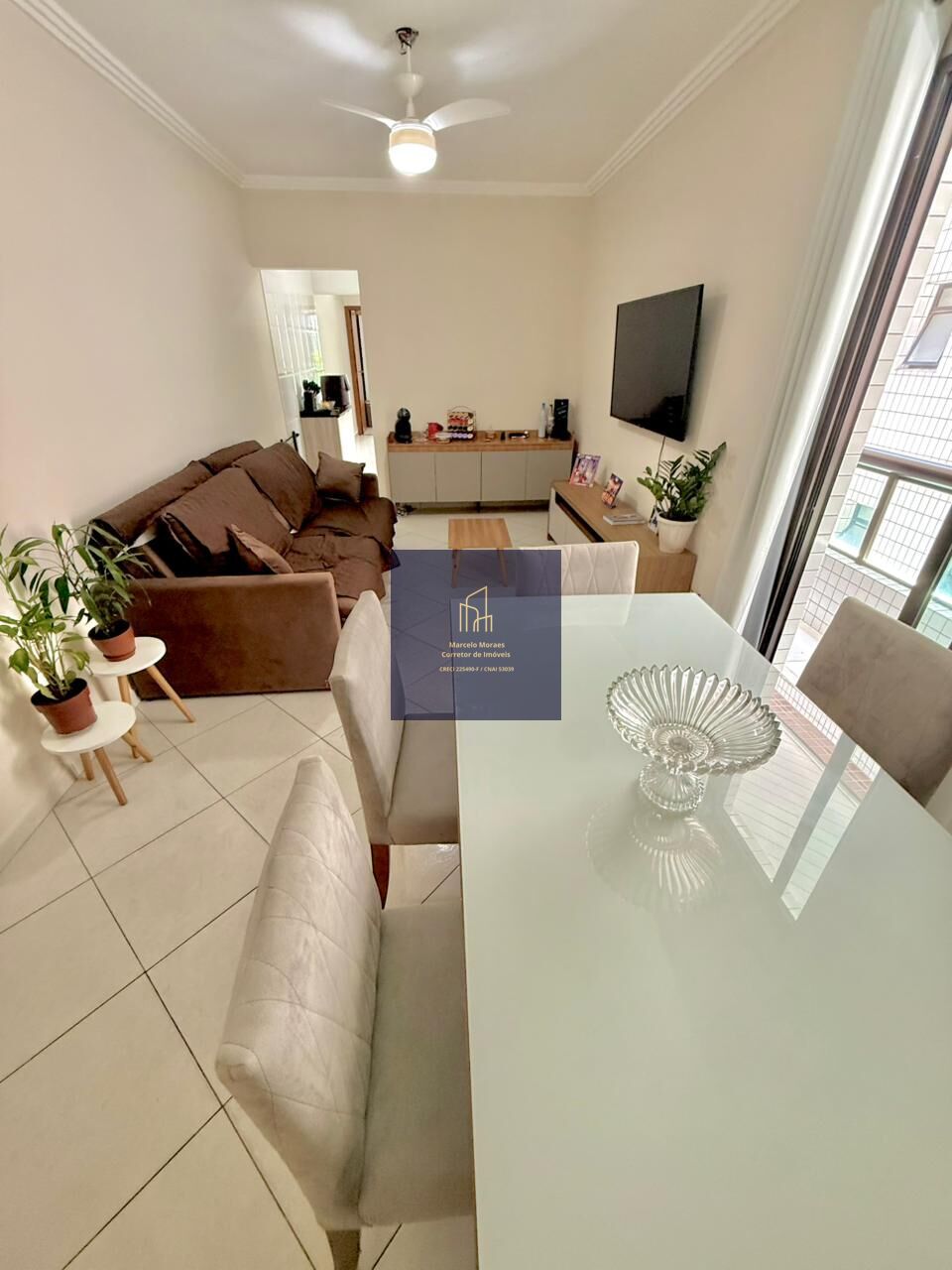 DESCRIÇÃO INTERNA: 1 dormitório, com 1 banheiro Social, sala ampla, sacada com churrasqueira à carvão, cozinha, área de serviço , área privativa de 57m².